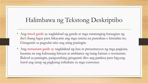 2. Nagpapakita ng kahalagahan: Ang deskiptibo ay nagbibigay ng karagdagang impormasyon tungkol sa isang bagay na hindi nakikita o nalalaman nang direkta. Ito ay nakakatulong upang maipakita ang kahalagahan ng isang bagay o pangyayari sa bawat indibidwal.