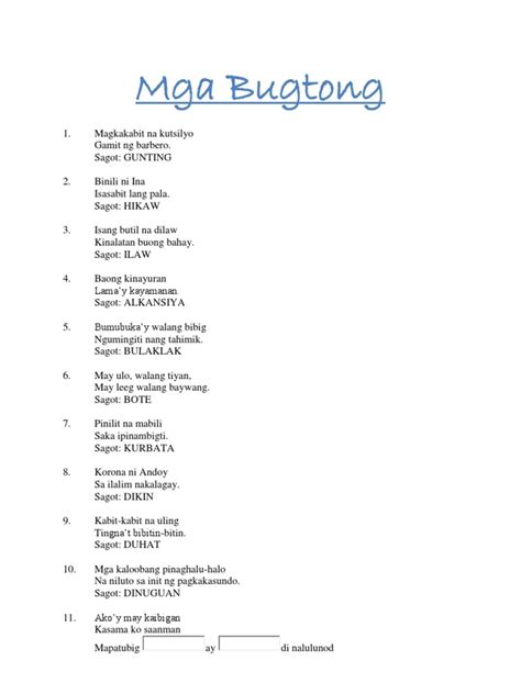 Ang Bugtong Na Bastos ay isang uri ng bugtong na naglalaman ng mga salitang may malalaswang kahulugan. Ito ay hindi lamang nakakagulat kundi nakakapagtaka rin dahil hindi ito ang karaniwang uri ng bugtong na ating nakasanayan. Ngunit, kailangan nating bigyan ng pansin ang ganitong uri ng kulturang bayan dahil ito ay nagpapakita ng iba't ibang aspekto ng ating lipunan. Sa panahon ngayon, kailangan nating maging maingat sa paggamit ng mga salita upang maiwasan ang pagkakaroon ng maling interpretasyon. Kung ikaw ay interesado sa pag-aaral ng Bugtong Na Bastos, narito ang ilan sa mga halimbawa nito: