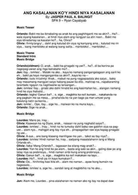 Bakit Parang Kasalanan Ko Script? Natanong ko sa sarili ko nang unang makita ang titulo ng script na ito. Ang nakapagtataka ay hindi ko pa man nababasa ang buong kwento, pero naramdaman ko na kaagad ang sakit, lungkot, at pagkabigo na maaaring nararanasan ng mga karakter sa kwento. Sa katunayan, may mga pangungusap na sa unang tingin ay tila walang kahulugan, subalit kapag binigyan ng atensyon ay magdadala sa iyo sa mas malalim na dimensyon ng kwento. Sa bawat pangungusap, mayroong mga salitang ginamit na nagpapakita ng koneksyon ng mga ideya at pinapakita rin ang damdamin ng bawat karakter. Kaya't hindi ko mapigilang mapaupo at simulan ang pagbabasa ng Bakit Parang Kasalanan Ko Script na may malaking kaba sa puso ko.